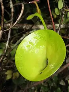 The unusual upper pitchers of N. inermis are larger than its lower pitchers, growing to 9 centimetres (3.5 in) in height and 5 centimetres (2 in) in width.[2] They gradually or abruptly arise from the ends of the tendrils, forming a 1–2 centimetres (0.4–0.8 in) wide curve.[2] They are tubular to infundibular in the lower two-thirds with laterally appressed pitcher walls. As in N. dubia, there is almost no gap between the walls in mature pitchers. The upper part of the pitcher is widely infundibular throughout. Wings are reduced to ribs in upper pitchers. The mouth is round and either horizontal or slightly raised at the front and rear. The inner surface of the pitcher is often said to be glandular throughout with no waxy zone,[9][10] but one source states that the waxy zone is merely reduced.[11] Mature upper pitchers are generally considered to completely lack a peristome, a trait that is unique to this species,[7][10] although one source gives a peristome width of 0.7 millimetres (0.03 in) for an 8 centimetres (3 in) tall upper pitcher (the inner portion of the peristome is said to account for 20% of its total cross-sectional surface length, the lowest proportion among studied species).[11] The lid is very long, narrow, and cuneiform. It is never reflexed beyond 90 degrees relative to the mouth.[7]
