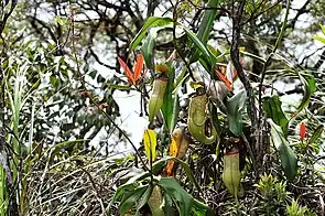 Nepenthes malayensis (A.Amin, M.N.Faizal & Dome), or the striped Malayan montane pitcher plant, is a large species of carnivorous tropical pitcher plant native and endemic to eastern mountains of Peninsular Malaysia. The peristomes on both upper and lower pitchers are profusely adorned by reddish bands, or stripes, making the species rather attractive. It grows close to mountain summits around 800–1000 m above sea level in partially shaded areas, though some individuals have been seen striving in open areas. The species was first observed in 2018 and initially thought to be conspecific with N. sanguinea. Nepenthes malayensis formal description was published in late 2020 in Kew Bulletin[1] and it is one of the latest three new Malayan species described in the same year (the other two was N. latiffiana and N. domei).[2] These discoveries have made Peninsular Malaysia home to 15 species of Nepenthes and there are over 150 species of world's Nepenthes with the majority of these are from the Malay Archipelago.