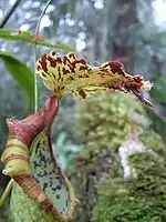 Rosette and lower pitchers are ovoid in the lower part, becoming cylindrical above. They are large, growing to 33.5 cm high by 6.8 cm wide. A pair of fringed wings (≤0.5 cm wide) runs down the ventral surface of the pitcher cup. Fringe elements are up to 1.9 cm long. The pitcher mouth is ovate and elongated into a short neck at the rear. The greatly expanded peristome may be up to 5.8 cm wide at the sides. Its inner margin is lined with distinct teeth, with those of the neck reaching 0.4 cm in length. The pitcher lid or operculum is ovate and has an unusual undulate margin. It measures up to 8.5 cm in length by 7.2 cm in width and has a cordate base. Four to five pairs of veins are visible on the upper surface of the lid. The lid bears two prominent appendages on its lower surface. The first is a hooked basal crest up to 0.7 cm long. The second is a triangular, dichotomous appendage present near the apex. This unique feature measures up to 1.4 cm in length and bears large nectar glands (0.5 to 1 mm in diameter). Smaller glands (0.1 to 0.5 mm in diameter) are concentrated along the midrib. An unbranched spur (≤2.8 cm long) is inserted near the base of the lid.[2]