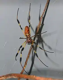 Trichonephila clavipes (formerly known as Nephila clavipes), commonly known as the golden silk orb-weaver, golden silk spider, or banana spider (a name shared with several others), is an orb-weaving spider species which inhabits forests and wooded areas ranging from the southern US to Argentina.[3] It is indigenous to both continental North and South America. Known for the golden color of their silk, the large size of their females, and their distinctive red-brown and yellow coloring, T. clavipes construct large, asymmetrical circular webs attached to trees and low shrubs in woods to catch small- and medium-size flying prey, mostly insects. They are excellent web-builders, producing and utilizing seven different types of silk,[4] and they subdue their prey by injecting them with venom, as opposed to related species which immobilize their prey by wrapping them in silk first. They are not known to be aggressive towards humans, only biting out of self-defense if touched, and their relatively harmless venom has a low toxicity, posing little health concern to healthy human adults. Due to their prevalence in forests, T. clavipes may be encountered by hikers.