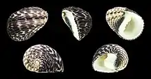 The shell is cream and mottled black in color with an inner surface of the flat-spired nerite smooth and white. It has a toothed shelf protecting the entrance. The outer surface is thick and roughly ridged, and tightly coiled.[2]