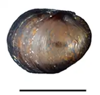Abapertural view of a shell of Neritina iris. Scale bar is 10 mm.