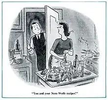 Wolfe views much of life through the prism of food and dining, going so far as to say that Voltaire "... wasn't a man at all, since he had no palate and a dried-up stomach."[16] He knows enough about fine cuisine to lecture on American cooking to Les Quinze Maîtres (a group of the 15 finest chefs in the world) in Too Many Cooks and to dine with the Ten for Aristology (a group of epicures) in "Poison à la Carte". Wolfe does not, however, enjoy visiting restaurants (with the occasional exception of Rusterman's, owned for a time by Wolfe's best friend Marko Vukcic and later subject to Wolfe's trusteeship). In The Red Box (chapter 11), Wolfe states, "I know nothing of restaurants; short of compulsion, I would not eat in one were Vatel himself the chef."