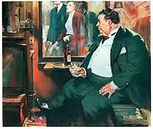 Wolfe's office becomes nearly soundproof when the doors connecting it to the front room and the hallway are closed. There is a small hole in the office wall covered by what Archie calls a "trick picture of a waterfall".[10] A person in an alcove at the end of the hallway can open a sliding panel covering the hole, so as to see and hear conversations and other events in the office without being noticed. The chair behind Wolfe's desk is custom-built, with special springs to hold his weight; according to Archie, it is the only chair that Wolfe really enjoys sitting in.[lower-alpha 6] Near the desk is a large chair upholstered in red leather, which is usually reserved for Inspector Cramer, a current or prospective client, or the person whom Wolfe and Archie want to question. In the short story "The Squirt and the Monkey", Wolfe and Archie have a hidden tape recorder and microphone installed in the office, with controls in the kitchen. In the story "Eeny Meeny Murder Mo", the system is modified to transmit sound to a speaker in the front room.
