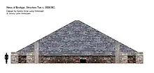 Structure 10 was discovered in 2008, and was described by excavators as "temple-like". It has walls 4 metres (13 ft) thick and still standing to a height of more than 1 metre (3.3 ft). The building is 25 metres (82 ft) long and 20 metres (66 ft) wide and a standing stone with a hole shaped like an hourglass was incorporated into the walls. There is a cross-shaped inner sanctum and the building was surrounded by a paved outer passage. It is believed to have been constructed around 2,900 BC, and appears to have been partly rebuilt around 2,800 BC, probably due to structural instability.[1] This is the largest structure of its kind anywhere in the north of Britain and it would have dominated the ritual landscape of the peninsula.