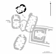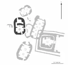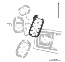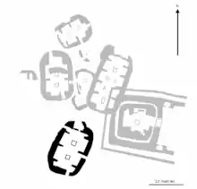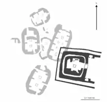 Structure 8 is roughly contemporary with structure 1, probably having been built just after structure 1 was completed.[17] It comprised ten piers and ten recesses, and had six hearths. The remains of at least two earlier buildings lie beneath it and structure 8 appears to have undergone severe subsidence itself. Its floor slumped in antiquity, causing the roof to fall in, and some of its stones were used to form structure 10.[17]