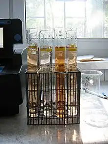 Nessler cylinders are used for colorimetric analysis, such as APHA color. The color of the substance contained in a Nessler cylinder is visually compared with the model. The tubes often carry out a series of calibrations of solutions of increasing concentrations, which functions as a comparative scale. To minimize differences in the subjective impression of the color of the solution of the substance to be analyzed, cylinders of a series should have the same characteristics - height, diameter, and thickness of glass. Basically, there are four types of used cylinders: