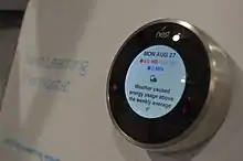 The Nest Thermostat is a smart thermostat developed by Google Nest and designed by Tony Fadell, Ben Filson, and Fred Bould.[1] It is an electronic, programmable, and self-learning Wi-Fi-enabled thermostat that optimizes heating and cooling of homes and businesses to conserve energy.[2]