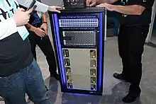 Previously known as LSI Engenio RDAC after NetApp acquisition the product renamed to NetApp E-Series. It is a general-purpose enterprise storage system with two controllers for SAN protocols such as Fibre Channel, iSCSI, SAS and InfiniBand (includes SRP, iSER, and NVMe over Fabrics protocol). NetApp E-Series platform uses proprietary OS SANtricity and proprietary RAID called Dynamic Disk Pool (DDP) alongside traditional RAIDs like RAID 10, RAID 6, RAID 5, etc. In DDP pool each D-Stripe works similar to traditional RAID-4 and RAID-6 but on block level instead of entire disk level, therefore, have no dedicated parity drives. DDP compare to traditional RAID groups restores data from lost disk drive to multiple drives which provide a few times faster reconstruction time[38] while traditional RAIDs restores lost disk drive to a dedicated parity drive. Starting with SANtricity 11.50 E-Series systems EF570 and E5700 support NVMe over Ethernet (RoCEv2) with 100Gbit/s Ethernet ports and NVMe over InfiniBand. Starting with EF600 systems are end-to-end NVMe and capable of NVMe/FC in addition to NVMe/RoCE and NVMe/InfiniBand. Sync and async mirroring are supported with SANtricity 11.50. SANtricity Unified Manager is a web-based manager that supports up to 500 EF/E-Series arrays and supports LDAP, RBAC, CA and SSL for authorization and authentication. In August 2019 NetApp announced E600 with support for NVMe/IB, NVMe/RoCE, NVMe/FC protocols, up to 44GBps of bandwidth and full-function embedded REST API.