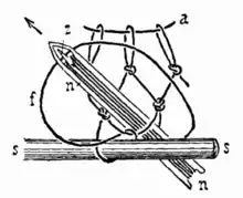 To avoid hauling a long length of loose twine through each knot, the twine is wound onto a netting shuttle or netting needle. This must be done correctly to prevent it twisting as it is used,[3] but makes net production much faster. A gauge – often a smooth stick – is used to keep the loops the same size and the mesh even. The first and last rows are generally made using a half-size gauge, so that the edges of the net will be smooth. There are also knot-free nets.