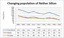 In 1881 the total population occupying Nether Silton was 176, consisting of 96 males and 80 females.[6] The changing population graph of Nether Silton, shows that since 1881 the population of those living in the village has continued to decrease. According to data from the Census the population in 2001 was 93, consisting of 44 males and 49 females.[5] 55% of the population are aged 45 years and above and the mean age of the population is 46.6 years.[5] Therefore, from the demographic statistics, Nether Silton has a declining population and also an emerging ageing population.