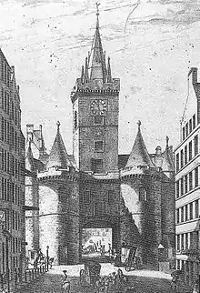 Besides, there were a number of small posterns.[12] The heads and limbs of executed criminals were regularly displayed above the ports.[21] Of the six ports, the Netherbow was the only one which took the form of a large fortified gateway. Repairs to the Netherbow are recorded in 1538,[22] and a drawing of 1544 shows the Netherbow as a wide arched gate flanked by two round towers. In 1571, the gateway between the towers was rebuilt, and a central clock tower was added above the gateway, topped by an octagonal stone spire. This structure was repaired in the early 17th century.[23]