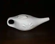 Neti pots are commonly used and rely on gravity and head position in order to rinse the outer sinus cavities. Typically they have a spout attached near the bottom, sometimes with a handle on the opposite side.[4]