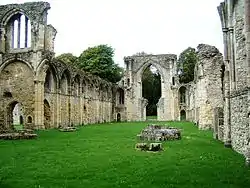 The central core of the monastery was surrounded by a precinct containing an outer (public) courtyard and an inner (private) courtyard, gardens, barns, guesthouses for travellers, stables, fishponds, the home farm and industrial buildings. The site was defended by a high bank and moat, part of which remains east of the abbey. Entrance was strictly controlled by an outer and inner gatehouse.[34] A chapel, known as the capella ante portas (Latin for chapel outside the gates) was placed by the outer gatehouse for the use of travellers and the local population. Of the precinct buildings, only the abbot's house, the moat and the fishponds have left visible remains.[35][36]