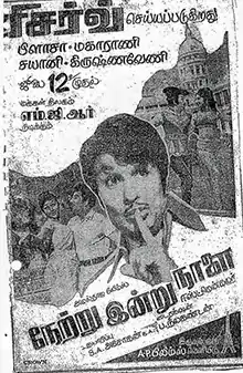 Netru Indru Naalai (transl. Yesterday, Today, Tomorrow) is a 1974 Indian Tamil-language film directed by P. Neelakantan. The film stars M. G. Ramachandran Manjula and Latha. It was released on 12 July 1974, and ran for 150 days in theatres.