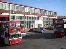 The two main sheds to the rear of the site were originally built in 1943 for Fairey Aviation and used to assemble wings for their Fulmar bomber until they were purchased by Warrington Corporation in 1947.[13] This site eventually became the main operational centre, with the frontage of the depot dating from 1964. The ground floor consists of a reception area and vehicle inspection bays, with the company's offices on the upper floor.[14]