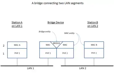 A network bridge is a computer networking device that creates a single, aggregate network from multiple communication networks or network segments. This function is called network bridging.[1] Bridging is distinct from routing. Routing allows multiple networks to communicate independently and yet remain separate, whereas bridging connects two separate networks as if they were a single network.[2] In the OSI model, bridging is performed in the data link layer (layer 2).[3] If one or more segments of the bridged network are wireless, the device is known as a wireless bridge.