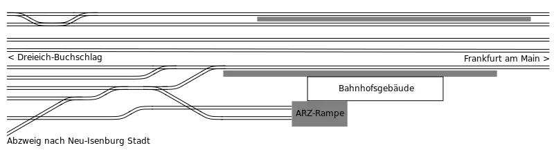 The western two tracks (line 3688) form station tracks 3 and 2, which are used by the S-Bahn. The next two tracks are part of line 3601, which is used by long-distance passenger and freight trains and do not abut platforms at the station. The single track line 3655, used by the Regionalbahn service between Dieburg and Frankfurt, forms platform track 1 through the station. East of track 1, are the tracks of the motorail terminal.