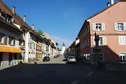 The town was founded in the later third of the 13th century by the Bishop of Constance according to a unified plan. The old city is a rectangle with a main east-west street and four parallel small streets. Much of the original character remains, though some renaissance elements were added in the 16th and 17th centuries. Only portions of the old city wall remain, though this includes the large Obertor tower.[8]