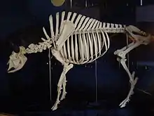The structure may also have been more hump-like than sail-like, as noted by Stromer in 1915 ("one might rather think of the existence of a large hump of fat [German: Fettbuckel], to which the [neural spines] gave internal support")[4] and by Jack Bowman Bailey in 1997.[5] In support of his "buffalo-back" hypothesis, Bailey argued that in Spinosaurus, Ouranosaurus, and other dinosaurs with long neural spines, the spines were relatively shorter and thicker than the spines of pelycosaurs (which were known to have sails); instead, the dinosaurs' neural spines were similar to the neural spines of extinct hump-backed mammals such as Megacerops and Bison latifrons.[5]