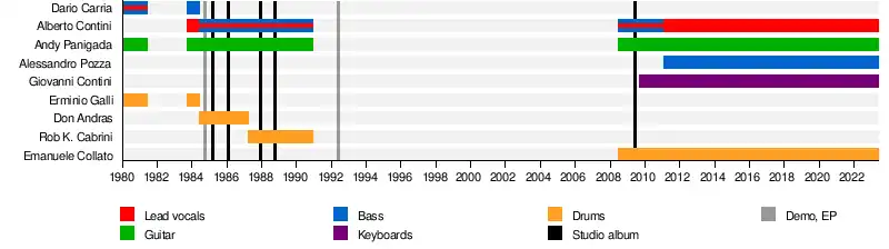 - Alberto "A.C. Wild" Contini – vocals (1983–1990, 2008–present), bass (1984–1990, studio 2008–2011)