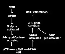 When NMB binds to its 7-TMR, the heterotrimeric G protein that is attached to the receptor is activated. The G-protein is called heterotrimeric because it consists of 3 polypeptides: α subunit, β subunit, and γ subunit. In the activated NMBR/G-protein complex, there occurs an exchange of GTP for GDP bound to G-α subunit. The G-α subunit, in turn, dissociated form the G-βγ subunits. The free G-α inactivates adenylate cyclase (AC), which, in turn, catalyzes the conversion of ATP to cAMP, the latter of which functioning as a second messenger. cAMP activates of the enzyme Protein Kinase A (PKA). PKA enters the nucleus and activates the cAMP response element-binding protein. The activated CREB binds along with CREB binding protein, co-activator to the CRE region of the DNA in the nucleus. CREB and CBP are held together by leucine zippers. CRE is the control that activates number of growth factors, and thus cell proliferation and some anti-apoptotic genes. In the brain, CREB plays a role in long-term memory and learning.