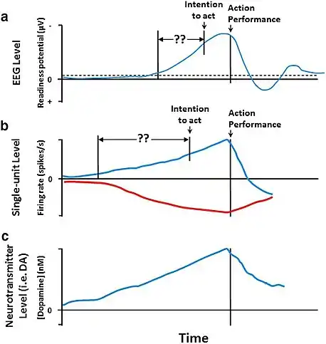 - Guggisberg, A. G.; Mottaz, A. (2013). "Timing and awareness of movement decisions: does consciousness really come too late?". Front Hum Neurosci. 7: 385. doi:10.3389/fnhum.2013.00385. PMC 3746176. PMID 23966921.