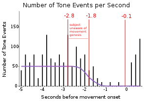 The graph shows the times at which unsuppressed responses to tones occurred when the volunteer moved. He showed many unsuppressed responses to tones (called "tone events" on the graph) on average up until 1.8 seconds before movement onset, but a significant decrease in tone events immediately after that time. Presumably this is because the subject usually became aware of his intention to move at about −1.8 seconds, which is then labelled point T. Since most actions are vetoed if a tone occurs after point T, there are very few tone events represented during that range. Finally, there is a sudden increase in the number of tone events at 0.1 seconds, meaning that this subject has passed point P. Matsuhashi and Hallet were thus able to establish an average time T (−1.8 seconds) without subjective report. This, they compared to ERP measurements of movement, which had detected movement beginning at about −2.8 seconds on average for this participant. Since T, like Libet's original W, was often found after movement genesis had already begun, the authors concluded that the generation of awareness occurred afterwards or in parallel to action, but most importantly, that it was probably not the cause of the movement.[58]