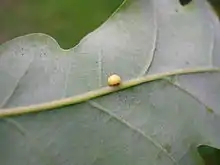 Emerging in autumn the parthenogenetic female of the agamic generation developed in the unilocular and unilarval bean-shaped structure, which is about 0.8 cm across, known as the 'oyster gall'; they lay eggs within the buds which result in the bisexual generation.[1][3]