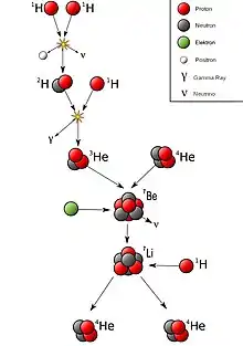 There are two main processes for stellar nuclear fusion. The first is the Proton-Proton (PP) chain, in which protons are fused together into helium, sometimes temporarily creating the heavier elements of lithium, beryllium, and boron along the way. The second is the CNO cycle, in which carbon, nitrogen, and oxygen are fused with protons, and then undergo alpha decay (helium nucleus emission) to begin the cycle again. The PP chain is the main process in the Sun, while the CNO cycle is dominant in stars like the Sun with 1.3 solar masses.[22]