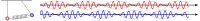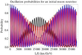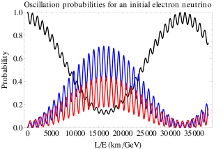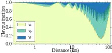 ![]() Electron neutrino oscillations, long range. Here and in the following diagrams black means electron neutrino, blue means muon neutrino and red means tau neutrino.[23] |