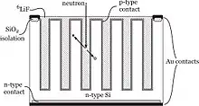 There are two basic types of semiconductor neutron detectors, the first being electron devices coated with a neutron reactive material and the second being a semiconductor being partly composed of neutron reactive material.[31] The most successful of these configurations is the coated device type, and an example would be a common planar Si diode coated with either 10B or 6LiF.[32] [33] This type of detector was first proposed by Babcock et al.[34] The concept is straightforward. A neutron is absorbed in the reactive film and spontaneously emits energetic reaction products. A reaction product may reach the semiconductor surface, and upon entering the semiconductor produces electron-hole pairs. Under a reverse bias voltage, these electrons and holes are drifted through the diode to produce an induced current, usually integrated in pulse mode to form a voltage output. The maximum intrinsic efficiency for single-coated devices is approximately 5% for thermal neutrons (0.0259 eV), and the design and operation are thoroughly described in the literature.[35] The neutron detection efficiency limitation is a consequence of reaction-product self-absorption. For instance, the range in a boron film of 1.47 MeV α particles from the 10B(n,α) 7Li reaction is approximately 4.5 microns, and the range in LiF of 2.7 MeV tritons from the 10B(n,α) 7Li reaction is approximately 28 microns. Reaction products originating at distances further from the film/semiconductor interface can not reach the semiconductor surface, and consequently will not contribute to neutron detection. Devices coated with natural Gd have also been explored, mainly because of its large thermal neutron microscopic cross section of 49,000 barns.[36][37] However, the Gd(n,γ) reaction products of interest are mainly low energy conversion electrons, mostly grouped around 70 keV. Consequently, discrimination between neutron induced events and gamma-ray events (mainly producing Compton scattered electrons) is difficult for Gd-coated semiconductor diodes. A compensated pixel design sought to remedy the problem.[38] Overall, devices coated with either 10B or 6LiF are preferred mainly because the energetic charged-particle reaction products are much easier to discriminate from background radiations.