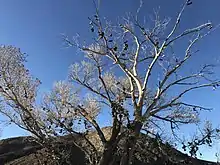 Nearby is a grove of cottonwoods, which includes a shoe tree. Patrons of the bar at Middlegate are unsure of the origin of the shoe tree; however, most believe it started sometime in the mid-1980s. A legend has formed about how a young man was traveling to Reno with his bride-to-be. When she balked and got out of the car, he threw her shoes in the tree so she couldn't get away. A reporter for the San Francisco Chronicle began to study the phenomenon of shoe trees after seeing the one at Middlegate, stating to his knowledge this was the biggest in the world.[20] It was discovered on December 31, 2010, that the original shoe tree had been chopped down, possibly by vandals. Since then visitors have started a new shoe tree with another tree in the grove.[21][22]