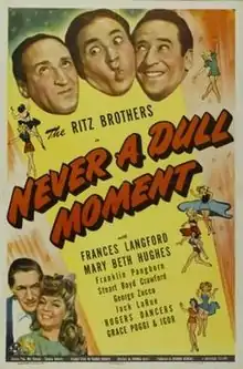Never a Dull Moment is a 1943 American comedy film directed by Edward C. Lilley and written by Mel Ronson and Stanley Roberts. The film stars Ritz Brothers, Frances Langford, Mary Beth Hughes, Franklin Pangborn, Stuart Crawford, George Zucco, Elisabeth Risdon and Jack La Rue. The film was released on November 19, 1943, by Universal Pictures.[1][2][3]