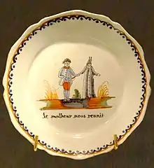 The faiences patriotiques of the Revolutionary period typically have one or two figures in the central section, rather crudely painted in a few colours, with a pro-revolutionary slogan or comment below in black cursive script. The earliest examples included pro-monarchist pieces.[56] The same style had been in use before the Revolution, and continued after it, the wider grouping being called faience populaire or faiences parlantes ("talking faience"). These were more comic or satirical than political.[57] Another type of pieces in this popular style, called faience patronymique, showed the patron saint of the recipient, and were common as christening or birthday gifts. These types were made in other centres, but Nevers was the leading producer.[58]
