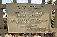 The bridge was named after long-serving local politician Neville Hewitt who served as the Minister for Lands, Forestry and Water Resources.[3][4]