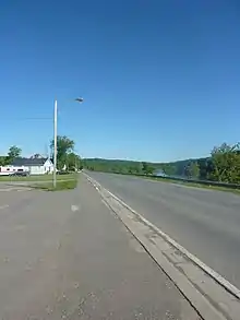 West of Fredericton, Route 105 continues along the east bank of the river, through Douglas and Keswick Ridge, crossing the Mactaquac Headpond. Between Mactaquac and Nackawic, the road was rerouted after construction of the dam and passes through areas such as Bear Island. The road changes direction to a north-south orientation as the river changes course between Nackawic and Woodstock. The Grafton Bridge, near the junction with Route 585, provides access to the town of Woodstock. Continuing north along the river's east bank, Route 105 passes through Hartland, Florenceville, Bristol, Bath and Perth-Andover. Crossing the Tobique River using the Tobique Narrows Dam, Route 105 passes through several more small farming communities and terminates at Route 108 in Grand Falls.[1]