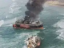 Since the vessel was no longer seaworthy and could not move under its own power, even if freed from the beach, the focus of the operation changed. Oil from the ship's fuel tanks continued to pose an environmental hazard, a situation exacerbated by both the ship's structural failure and continuing pounding from the surf. In order to mitigate the damage the Unified Command decided to set the fuel tanks on fire in order to burn off the oil. The first attempt was made on 10 February. Napalm and other incendiary devices were used to ignite the fuel, but only one of the diesel tanks was burned effectively. A second attempt was made on 11 February when US Navy explosive experts placed 39 shaped charges to breach the top of the fuel tanks from within the cargo holds. 602 U.S. gallons (2,280 L) of napalm and nearly 397 pounds (180 kg) of plastic explosives were also used to ignite the fuel on board. The ship burned for approximately 33 hours.[12] Additional smaller-scale attempts were made to burn more oil over the next two days, with limited success. The total amount of oil that was burned is estimated to be between 165,000 and 255,000 US gallons (620 and 970 m3).[12] The structural stress caused by the fire, combined with continued severe weather, caused the vessel to break into two sections around midnight on 11 February.