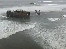 A project to remove the stern by dismantling it on the beach was started in June 2008, after Oregon legislative approval.[18] The dismantling, expected to cost US$18 million, was approved by the State Legislative Emergency Board in September 2006.[19] The move was originally scheduled for 2007, but delays in the negotiations pushed the project back a year. Due to weather and surf conditions, the project had to be undertaken during the spring and summer months.[19] Titan Maritime Company, a subsidiary of Crowley Maritime Corporation, signed a US$16.4 million contract with the Oregon Department of State Lands.[15][20] Titan Maritime used large jackup barges, Karlissa A and Karlissa B, for the New Carissa dismantling project. Once the barges were in place, a cable car system was installed to allow the crews and their equipment access to the barges from the beach.[18] The barges allowed the crews to access the wreck from 40 feet (12 m) above the surf.[18] The crews cut New Carissa into removable pieces and then lifted them to the barges with cranes.[17] The cutting portion of Titan's plan was largely completed by 31 July 2008, and the company then focused on pulling the stern from the sand, a process that was measured in inches.[21][22] The project's managing director expressed confidence that the removal deadline of 1 October 2008 would be met.[18][23] By September 2008, Titan had successfully removed the majority of the wreck; no part of the ship was visible from above the water and only a few small pieces remained submerged.[24] Karlissa A and Karlissa B were relocated on 12 October 2008, and Titan's shore operations were completely removed by November 2008.[25]