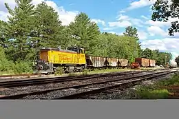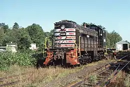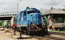 In 1985 the railroad purchased its first two non-leased locomotives, an EMD GP18, #503, and an EMD GP7, #302, from the bankrupt Chicago, Rock Island and Pacific Railroad. The locomotives were painted in a green and yellow scheme and went to work immediately.[1] 302 was originally slated to work on the B&M trackage near Worcester with access to Gardner, but that deal fell through when the Providence & Worcester Railroad objected.[1] Access to trackage between Manchester and Boscawen had bolstered the railroad's yearly carloads from 250 to nearly 2,750, much of which was due to Blue Seal Feeds at Bow Junction, and International Salt in Bow.[1] In the late 1980s the railroad was also operating a Reload on former B&M branch in Chicopee Falls, Massachusetts for Georgia Pacific, and provided rail-plant maintenance and on-site switching at the SD Warren Paper Mill in Skowhegan, Maine. NEGS also performed various maintenance-of-way contracts around New England, in MA, ME, NH and VT.[1] Less fortunate, was a proposed significant aggregate move from Columbia Falls-Centerville, Maine area, west to deep water near Bucksport, over the former Maine Central's Calais Branch of Maine DOT, which fell through. A 1988 bid on the ex-Grand Trunk line in Maine, New Hampshire and Vermont, went instead to the St. Lawrence & Atlantic Railroad.