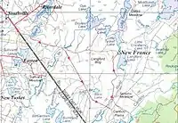 Some maps have New France incorrectly placed about 2 miles (3 km) to the west of its actual location, on a road that may not be passable.