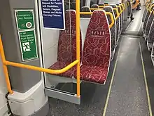 The rectification work solves the disability access problem by providing a toilet module for both centre (wheelchair accessible) cars.[37] This means that wheelchairs no longer have to travel around the toilets to access them from behind.[37] No major changes were made to the general seating other than recovering some of the seats with priority labelling including some transverse seats with high backs and no arm rests.[37]