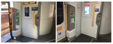 Some changes were made to signage throughout the train on the advice of disability groups; purportedly as "better wording" but the differences would be minor to the average person - intended instead for the minority of people with literacy difficulties (see difference between green emergency door release wording above).