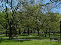 While once the edges of the Green were covered with a glorious canopy of elms, planted originally by James Hillhouse, most died of dutch elm disease. In the 1980s, through the efforts of the Garden Club of New Haven, disease-resistant elms were planted in an attempt to memorialize the legacy of the trees that gave New Haven the nickname "Elm City".