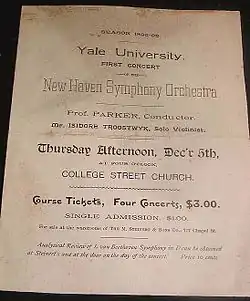 The first performance of the NHSO took place January 25, 1895 at a now-defunct theater on Chapel Street in New Haven near the present-day Union League Café. The program included works by Bach, Beethoven, Mendelssohn, and Schubert, as well as two solos performed by Isidore Troostwyk, a Dutch-born violinist who had recently arrived as a Professor of Music at Yale. Troostwyk served as concertmaster of the new orchestra.