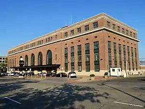 Union Station, also known as New Haven Railroad Station (IATA: ZVE) or simply New Haven, is the main railroad passenger station in New Haven, Connecticut. It is the third such station in the city of New Haven, preceded by both an 1848 built station in a different location, and an 1879 built station near the current station's location. Designed by noted American architect Cass Gilbert, the present beaux-arts Union Station was completed and opened in 1920 after the previous Union Station (which was located at the foot of Meadow Street, near the site of the current Union Station parking garage) was destroyed by fire.[5] It served the New York, New Haven and Hartford Railroad for the next five decades, but fell into decline following World War II along with the United States railroad industry as a whole.