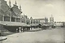 New Market's growth kept pace with the city until World War II. The northern portion of the market came up in 1909 at an expense of 6 lakh rupees. Despite the gathering storm of World War II, an extension was engineered on the south flank, and the historic clock tower on the southern end of the market was shipped over from Huddersfield and installed in the 1930s.[5] Florists were located near the front entrance, and stalls selling fresh and preserved foods were placed towards the rear of the market. Beyond the vegetable stalls, fishmongers and slaughterhouse butchers plied their trade, and, until the mid-1970s, at the very back of the market, exotic animals from all over the British Empire could be bought as pets.