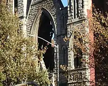On December 5, 2020, a six-alarm fire spread from an adjacent vacant building, engulfed the church structure, and left intact only the exterior stone walls.[6][14] The fire, accidentally caused by electrical wiring,[15] took nearly eight hours to extinguish.[4][5] The church roof collapsed,[7] the Tiffany windows were blown out, and the sanctuary was destroyed.[4] Only the "Liberty Bell" and the exterior survived,[7][16] including the tower in which the bell hung.[13]