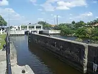 The North New River Canal served as a significant transportation route to and from the state's interior section south of Lake Okeechobee.[5] Steamships and other boats traveled the length of the canal bringing lumber, farm equipment, and people to communities such as Okeelanta and South Bay in the area south of the lake.[6] The boats then ferried produce from the communities' farms back to the coast, where the goods were shipped north by rail.[6] Due to shoaling (silting) in the canal and newly constructed road and rail links to the interior section, Lock No. 1 was closed to boat traffic in 1926.[6]