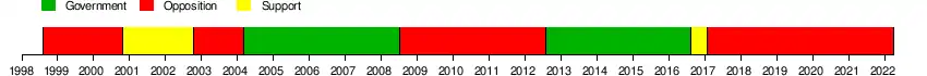 | Year | Leader | Popular vote | % of popular vote | # of seats | Seat change | Coalitions | Status |